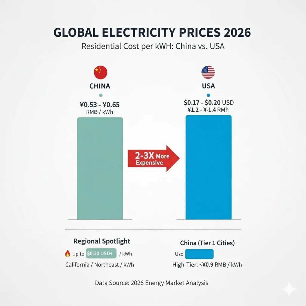 拿美国来说,普通居民用户用电价格明显比中国贵。2026年全美居民平均电价约为 0.17 - 0.20 美元/度(约 1.2 - 1.4 元人民币),几乎是中国平均水平的 2 到 3 倍。在加州或东北部(如麻省、纽约),居民电价甚至可能高达 0.30 美元/度以上。